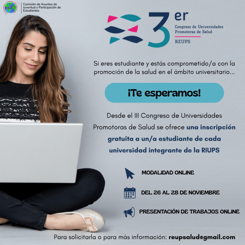 Desde la Red Española de Universidades Promotoras de Salud (REUPS), se dará 1 inscripción gratuita a alumnado perteneciente a universidades integrantes de la RIUPS (por orden de inscripción). Pueden pedir más información en: reupsalud@gmail.com .
