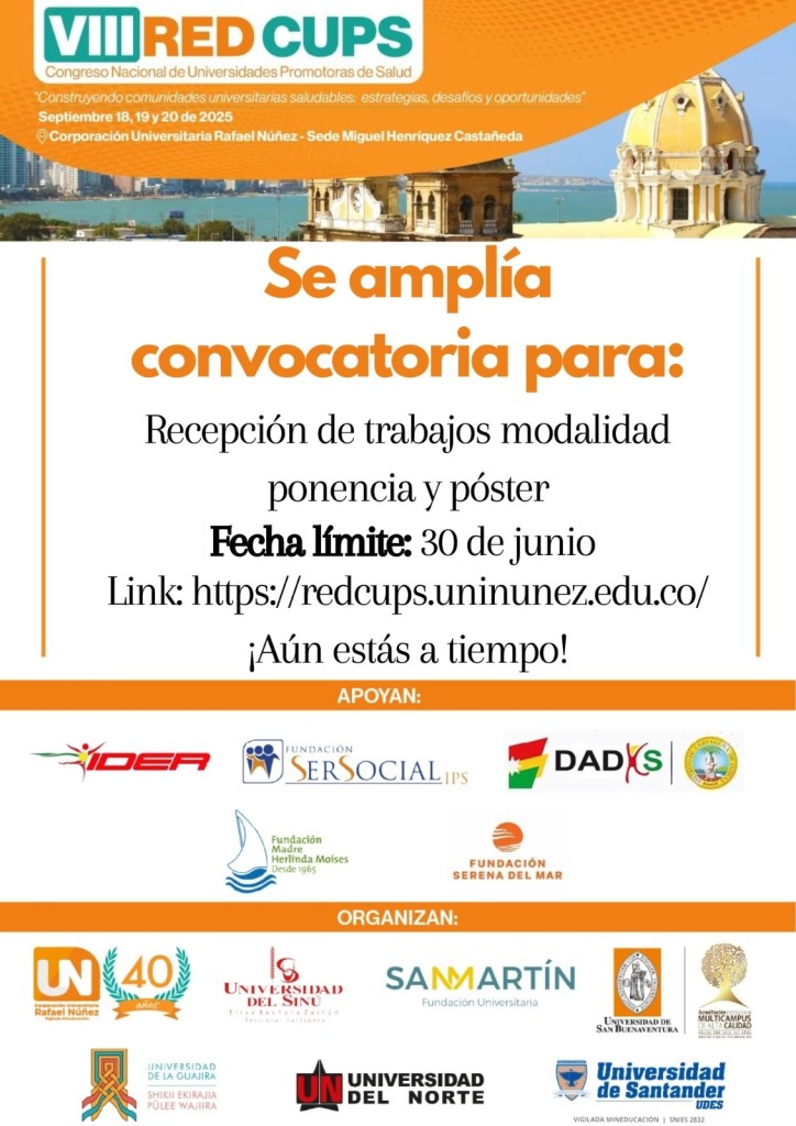 La Red Colombiana de Instituciones de Educación Superior y Universidades Promotoras de la Salud (REDCUPS) Nodo Caribe presenta el VIII Congreso Nacional de REDCUPS. Este evento académico tendrá lugar del 18 al 20 de septiembre en la sede de la Universidad Rafael Núñez, Cartagena (Colombia).