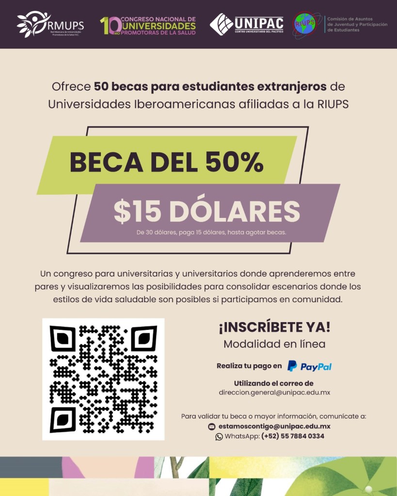 Además, con el objetivo de promocionar la participación de estudiantes extranjeros de universidades afiliadas a la Red Iberoamericana de Universidades Promotoras de la Salud (RIUPS), la RMUPS ofrece 50 becas de inscripción con un 50% de descuento. De esta forma, el coste total sería de 15 dólares.